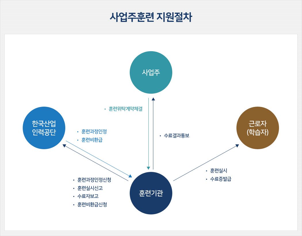 사업주가 고용하고 있는 근로자를 훈련기관에 위탁하여 훈련을 실시하는 경우, 소정의 훈련 비용을 사업주에게 지원하는 과정